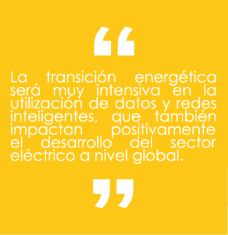 Esta transición representa para el sector eléctrico una gran oportunidad de ofrecer nuevas soluciones que permitan el uso cada vez más eficiente de la energía, desde su generación hasta su distribución. Además, la transición energética será muy intensiva en la utilización de datos y redes inteligentes, que también impactan positivamente el desarrollo del sector eléctrico a nivel global.