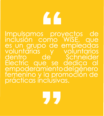 Partiendo de esta búsqueda de múltiples perspectivas, también impulsamos proyectos de inclusión como WiSE, que es un grupo de empleadas voluntarias y voluntarios dentro de Schneider Electric que se dedica al empoderamiento del género femenino y la promoción de prácticas inclusivas. Su enfoque principal radica en participar en el diseño de políticas y procedimientos que creen entornos inclusivos, promoviendo la importancia de la equidad de género y la eliminación de sesgos. Además, buscan fomentar la educación y capacitación para remover barreras y promover el liderazgo femenino tanto dentro como fuera de la empresa.