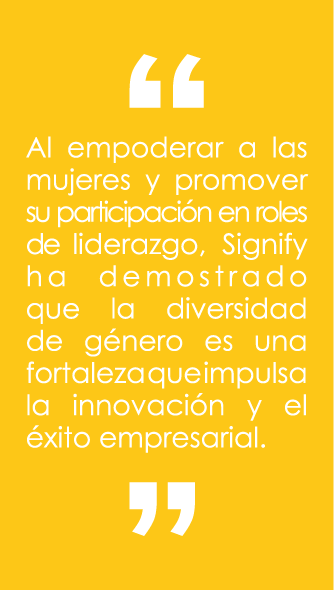 En el ámbito interno, Signify está comprometido con el desarrollo profesional de sus colaboradores, brindando oportunidades equitativas para todos. Se han implementado políticas que fomentan la diversidad de género en la contratación y promoción, así como un entorno de trabajo inclusivo y respetuoso.