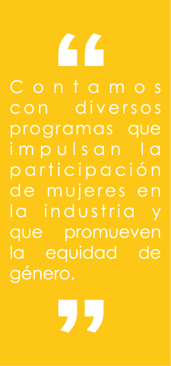 Contamos con diversos programas que impulsan la participación de mujeres en la industria y que promueven la equidad de género, iniciando por la difusión de información en nuestro código de ética, la revisión periódica de salarios para nivelaciones por puesto y no por género, conferencias de equidad de género, actividades que conmemoran el Día Internacional de la Mujer, reclutamiento externo e interno sin distinción de género, programas de capacitación que impulsan y desarrollan las competencias del personal femenino para ocupar otros cargos, entre los que se encuentran los programas de sucesión.