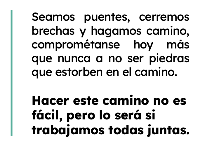 Así que, a partir de hoy, si alguno de ustedes ve una piedra que estorba para lograr la equidad o la inclusión, ¡quítela del camino! Úsenla para construir un puente y conectar mejor a esta sociedad, porque serán nuestros hijas e hijos quienes recorran este camino empedrando.
