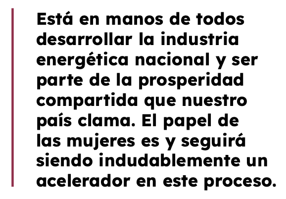 Hoy es tiempo de mujeres, nadie tiene duda y el sector energético no es la excepción, con orgullo y admiración sigo el actuar de mujeres talentosas y coherentes que dirigen por igual institutos de educación e investigación, empresas petroleras y eléctricas de relevancia mundial, laboratorios, entidades de metrología, de estandarización, secretarias de estado y gobiernos de los tres órdenes, incluida, por vez primera, la Presidencia de la República.