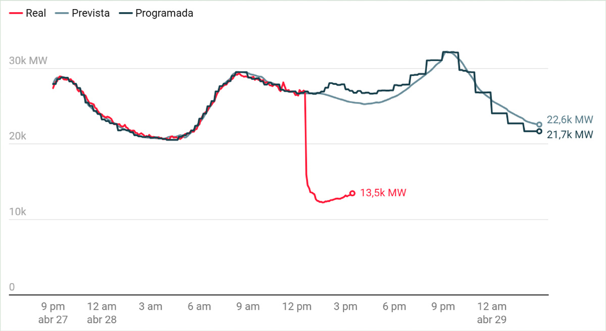 Figura 2. Gráfica de demanda de España el 28 de abril de 2025, elaboración: El Grand Continente, con datos de Red Eléctrica de España. Fuente: https://legrandcontinent.eu/es/2025/05/01/apagon-que-paso-en-espana-7-puntos-sobre-las-causas-del-megacorte/