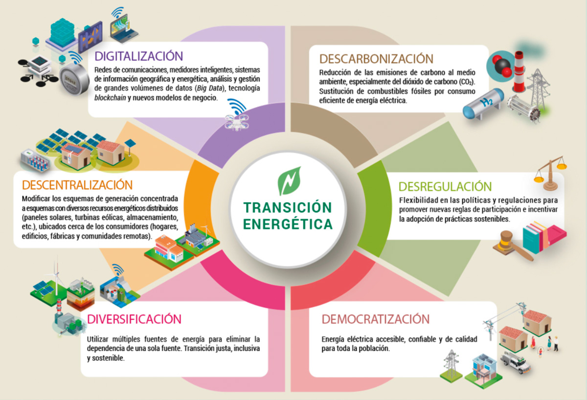 En (5) se describe que la transición energética busca reemplazar gradualmente a los combustibles fósiles (carbón, petróleo y gas) por fuentes de energías limpias y sostenibles. Asimismo, establece que cada país utiliza lo mejor de la tecnología para apoyar políticas públicas formuladas con base en acuerdos internacionales. Las acciones son de diversa índole y enfoque, pero sobresalen 6 megatendencias conocidas como las 6D que contribuyen al futuro del sector energético.