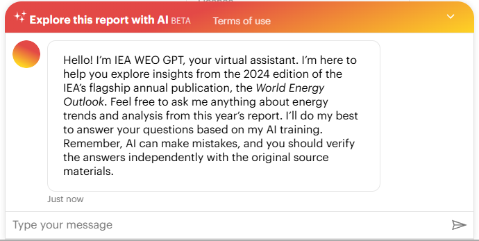 Figura 8. Interfaz de usuario del chat con IA Generativa de la AIE para consulta del informe World Energy Outlook. Fuente: https://www.iea.org/reports/world-energy-outlook-2024.