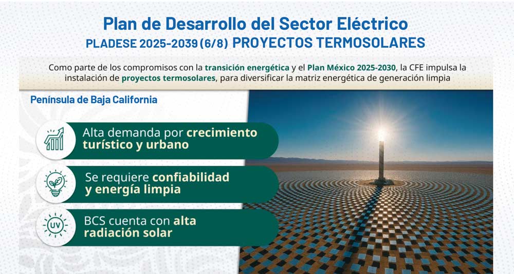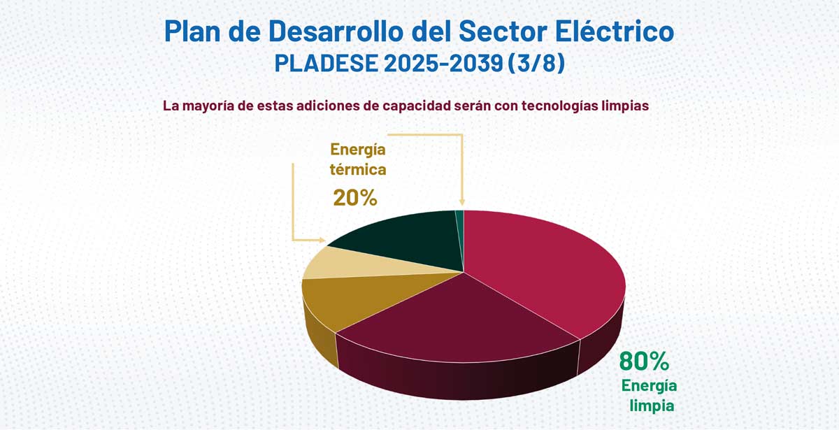El PLADESE establece una visión clara de largo plazo, con metas concretas en transición energética y mitigación de emisiones. Entre los objetivos medulares mencionó que la participación de energías limpias alcance 38 % en 2030, equivalente a una generación de 170 TWh (teravatio-hora), y que para 2039 esta proporción se eleve a 48 %, con una generación estimada de 268 TWh.
