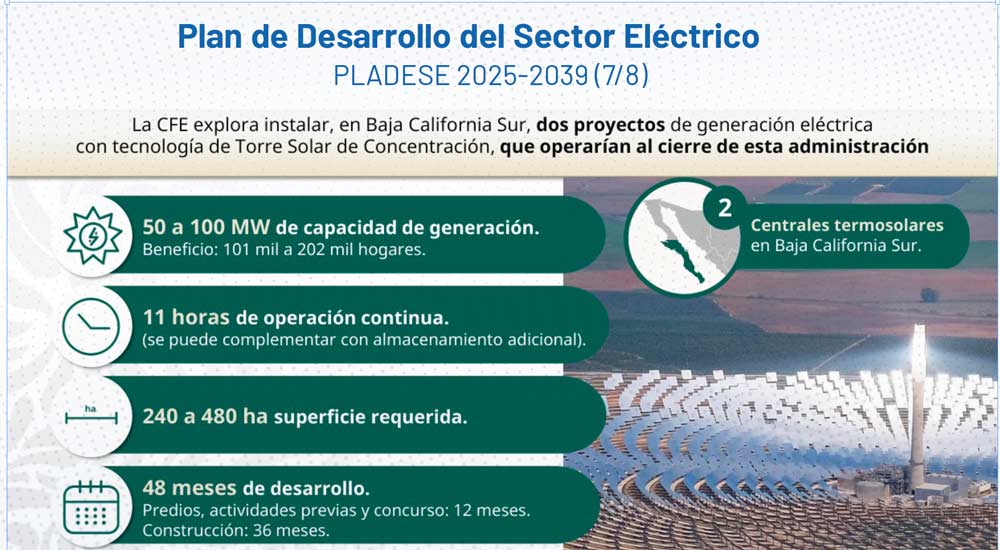 Destacó que estas tecnologías son una oportunidad estratégica para el desarrollo de cadenas de valor nacionales, desde la fabricación de componentes —como heliostatos, receptores y sistemas de almacenamiento térmico— hasta las etapas de diseño, construcción, operación y mantenimiento. Este planteamiento contribuye a impulsar el contenido nacional, promover la transferencia tecnológica y generar empleo especializado.